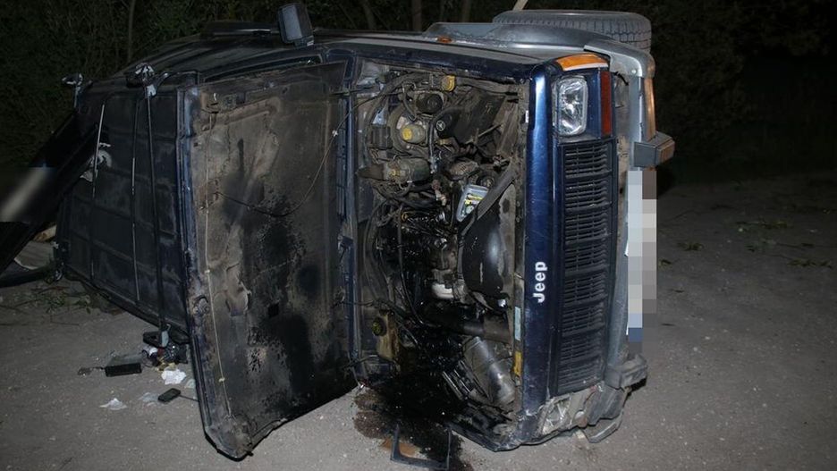 20-latek próbował driftować jeepem dziadka. Uderzył w beton i przewrócił auto. Ranny kolega na fotelu pasażera
