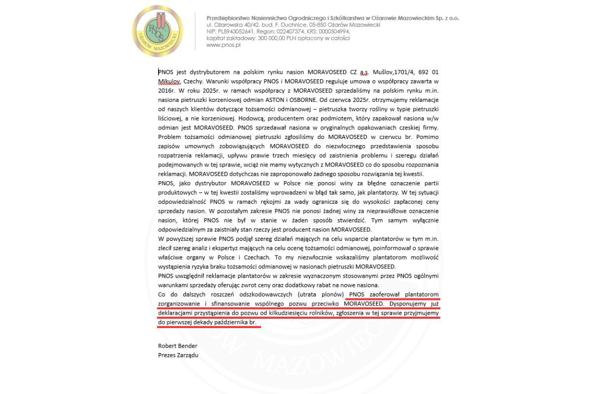 Afera pietruszkowa — pozew zbiorowy — rolnicy i PNOS przeciwko Moravoseed