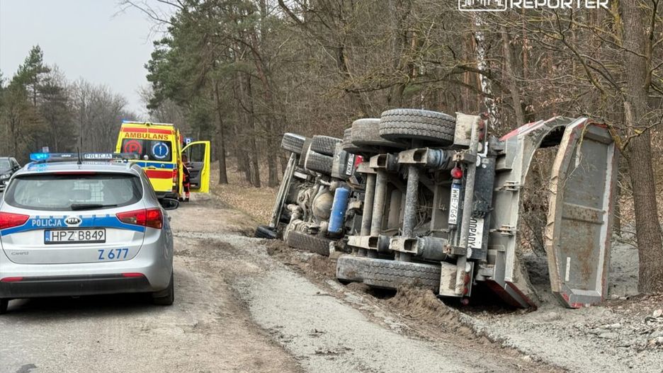 Przed południem na DW631 na wysokości miejscowości Sieraków (pow. wołomiński) doszło do przewrócenia się samochodu ciężarowego.