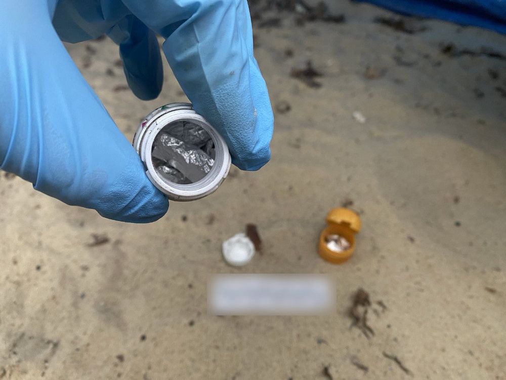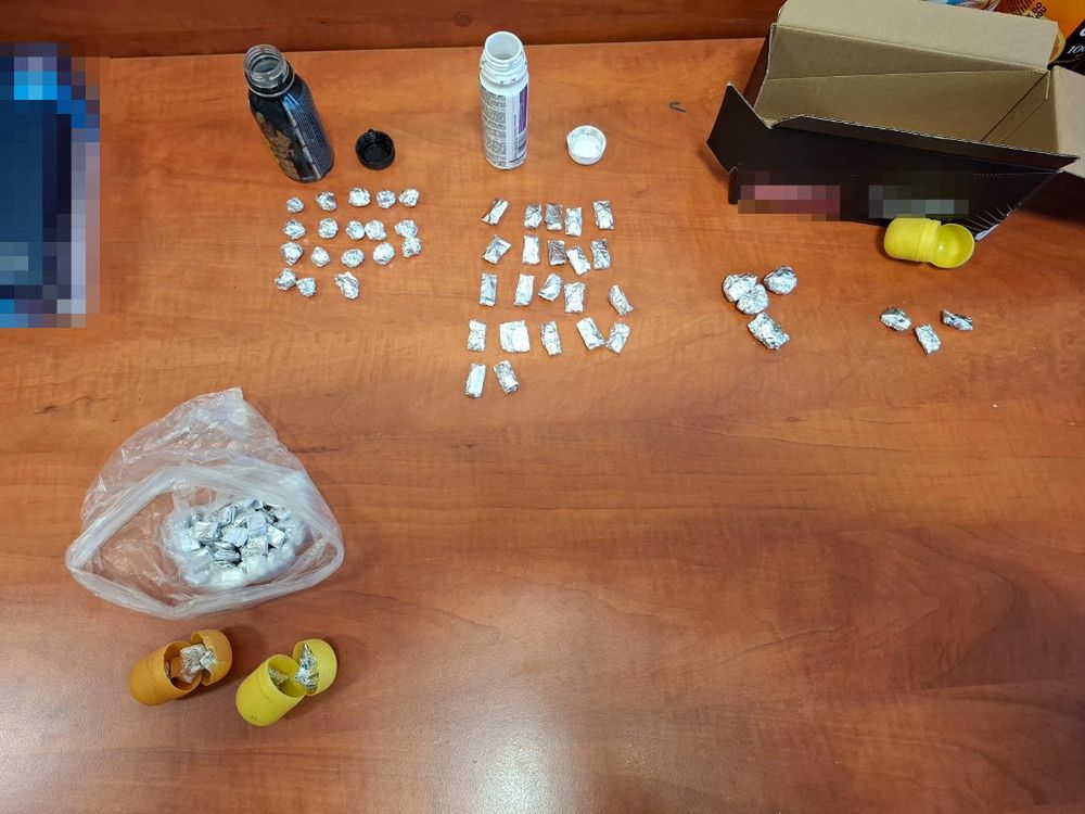 Policjanci zabezpieczyli ich telefony komórkowe oraz kilka tysięcy złotych. Następnie szczegółowo przeszukali podwórze. W piaskownicy znaleźli woreczek foliowy, w którym było ponad 40 zawiniątek z beżowym proszkiem, dwa plastikowe jajka zawierające kilkanaście zawiniątek z białą i beżową substancją, butelkę plastikową, w której ukrytych było kolejnych 18 zawiniątek z folii aluminiowej i białym proszkiem i pojemnik plastikowy zawierający 22 zawiniątka z białym proszkiem. Kolejne poporcjowane już narkotyki policjanci znaleźli w koszu na śmieci.