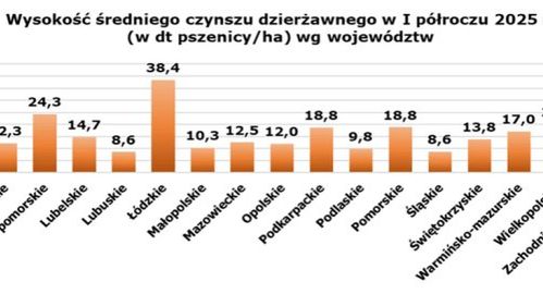 Warto również zwrócić uwagę na wzrost średniego czynszu dzierżawnego, który wyniósł 13,6 dt/ha (decyton pszenicy na hektar). W porównaniu do analogicznego okresu w 2024 roku, czynsz wzrósł o 18%, co świadczy o rosnącej wartości dzierżawionych gruntów. Tradycyjnie, najwyższe czynsze odnotowano w województwach o najżyźniejszych glebach: