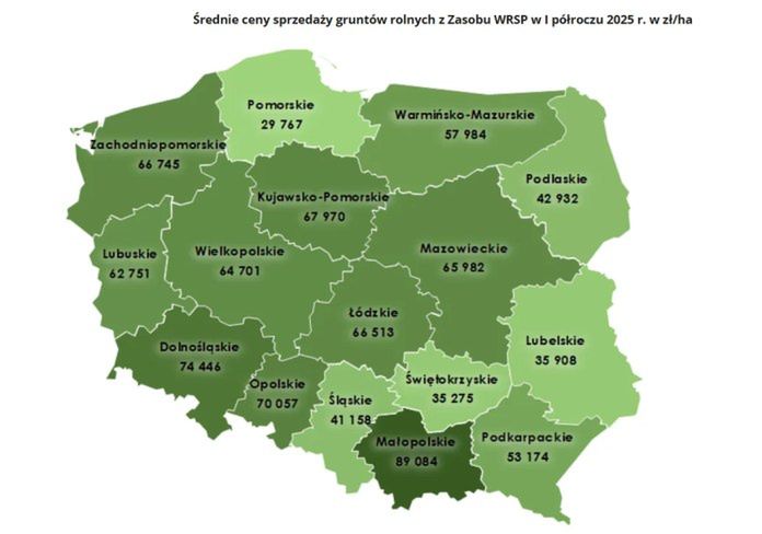 Chociaż dzierżawa dominuje, KOWR aktywnie sprzedaje również grunty rolne. Sprzedaż jest formą trwałego rozdysponowania mienia i w pierwszym półroczu 2025 roku sprzedano prawie 2,2 tys. ha gruntów rolnych. Średnia cena za hektar wyniosła 61 165 zł, co oznacza wzrost o 22% w stosunku do ubiegłego roku. Najwyższe ceny tradycyjnie uzyskano na mniejszych działkach (do 2 ha), gdzie hektar kosztował średnio 71,6 tys. zł, a najwyższą cenę w skali kraju odnotowano w województwie małopolskim – 89 084 zł/ha.