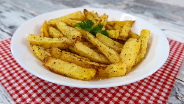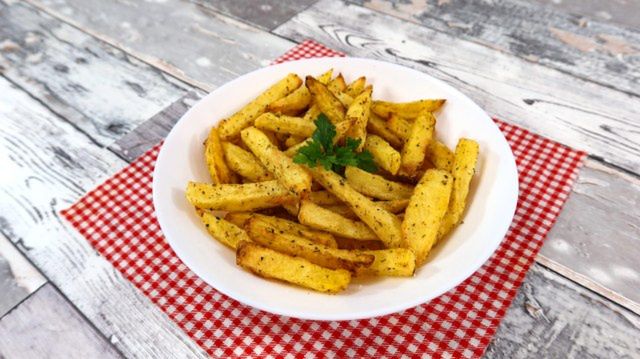 Tak przygotowane frytki przekładamy do koszyka air fryera, równomiernie je rozkładając. Pieczemy przez 25–30 minut w temperaturze 180°C, w trakcie pieczenia 4–5 razy potrząsając koszykiem lub mieszając frytki, aby upiekły się równomiernie.