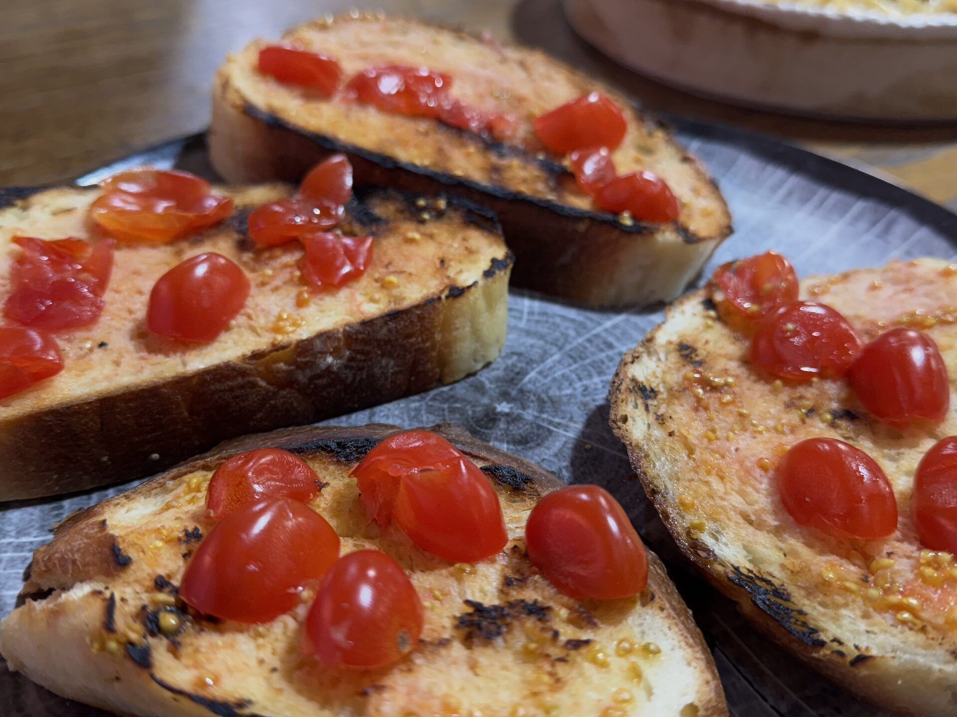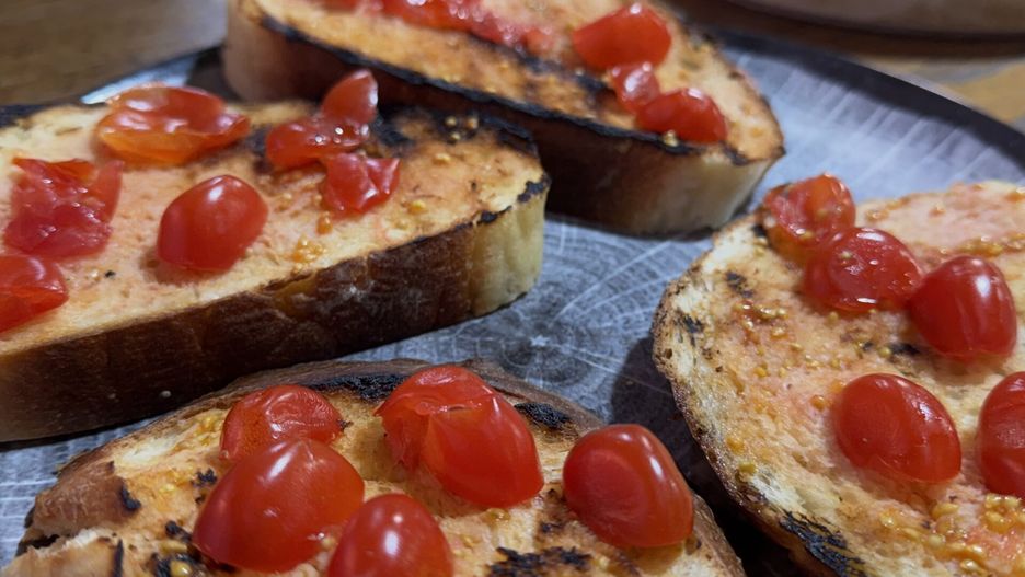 - Nałóż mieszankę pomidorową na ciepłe pieczywo i skrop odrobiną oliwy.
