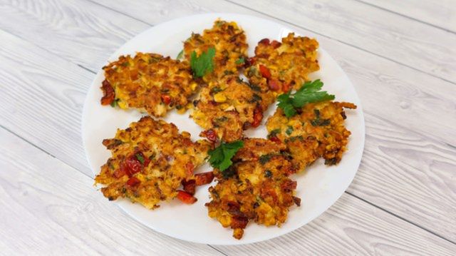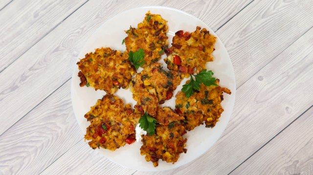 Umytą i oczyszczoną pierś z kurczaka kroimy w małą kostkę i umieszczamy w misce. Obraną z gniazd nasiennych paprykę kroimy w małą kostkę. Obraną cebulę dość drobno siekamy. Pokrojone warzywa dodajemy kurczaka. Następnie wrzucamy odsączoną z zalewy kukurydzę oraz starty żółty ser, dodajemy jajka, mąkę, przyprawę do gyrosa, czosnek granulowany oraz czarny pieprz. Wszystkie składniki dokładnie ze sobą łączymy. Na patelni z niewielką ilością rozgrzanego oleju smażymy niewielkie placki z obu stron, aż będą złociste i chrupiące. Usmażone placki zdejmujemy z patelni i odsączamy z nadmiaru tłuszczu na papierowym ręczniku.