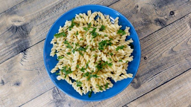 Makaron gotujemy według instrukcji na opakowaniu w lekko osolonym wrzątku, a następnie odcedzamy, zostawiając około 1/2 szklanki wody z gotowania. Na patelni z rozpuszczonym masłem podsmażamy przeciśnięty przez praskę czosnek i smażymy przez około 30 sekund, aż zacznie pięknie pachnieć. Następnie zmniejszamy ogień, dodajemy śmietanę i wszystko razem łączymy, dodajemy wodę z gotowania makaronu, całość mieszamy, a na końcu dodajemy ugotowany makaron. Całość doprawiamy solą oraz czarnym pieprzem i wszystko jeszcze raz mieszamy. Tak przygotowany makaron podajemy z posiekaną natką pietruszki.