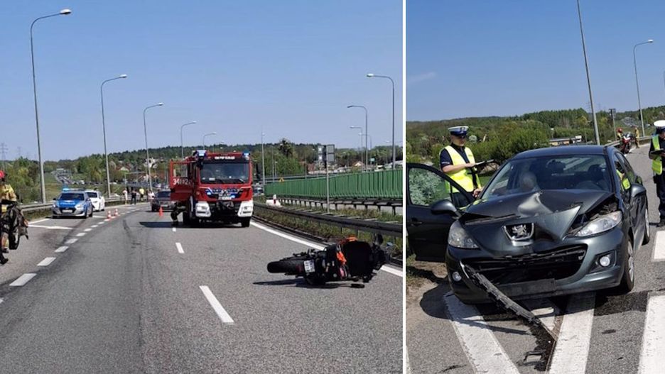 Z ustaleń policjantów pracujących na miejscu wynika, że na tył motocykla, którym kierował 47-letni mężczyzna, najechał 82-latek kierujący osobowym peugeotem. Motocyklista zaraz po zdarzeniu został przewieziony karetką do szpitala. Kierujący peugeotem był trzeźwy. Na miejscu wypadku pracowali policjanci z wydziału ruchu drogowego. Są utrudnienia w ruchu.
