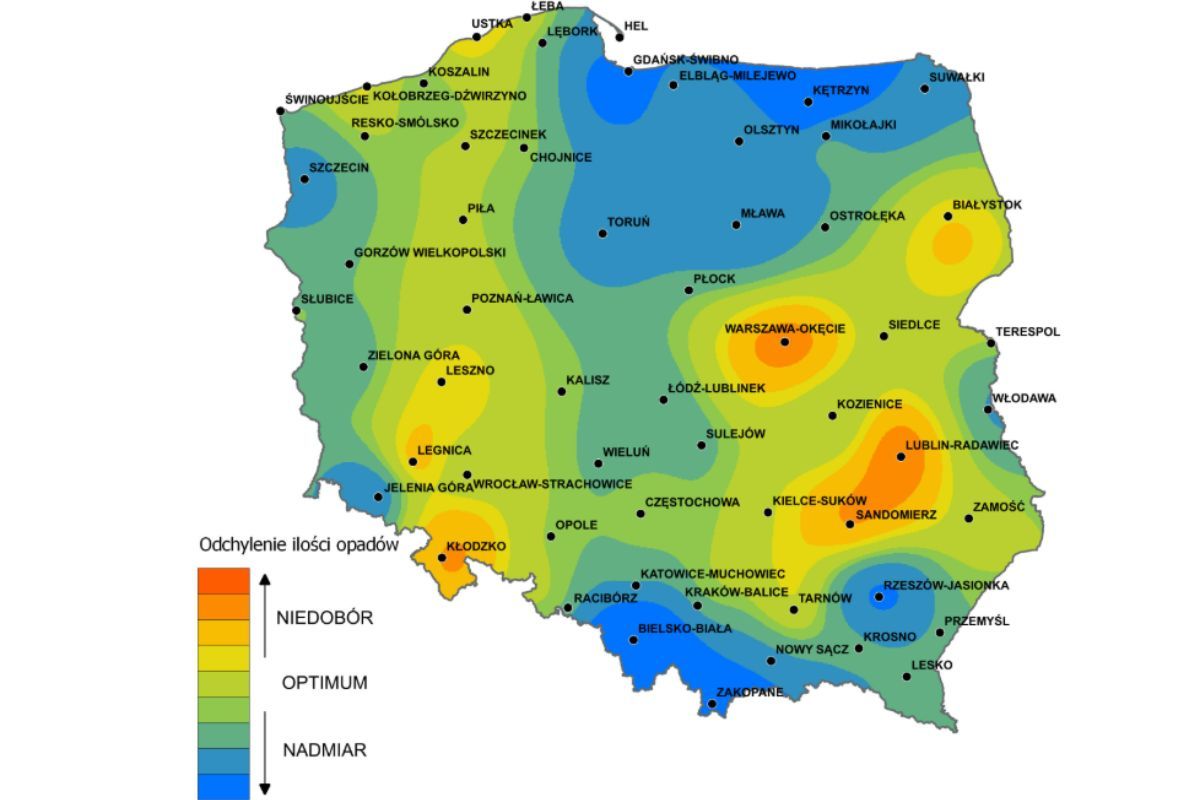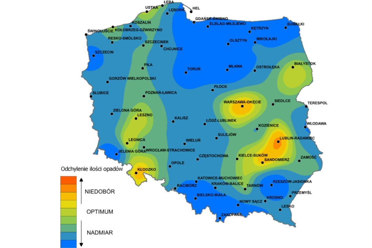 Mianowicie obszar niedoborów wody obejmował ten analogiczny dla kukurydzy, jednak pasy były znacznie szersze. O ile kukurydza mogła w lipcu odczuwać niedobór wilgoci na mniej więcej 1/3 terytorium Polski, o tyle burak miał komfortowe warunki wzrostu jedynie na 1/3 terytorium kraju.