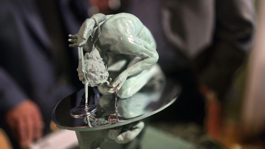 Rysunek nazwał „elektrokardiogramem” twórcy – zapisem, którego nie da się udawać, bo zdradza najdrobniejsze wahnięcia. Ta fraza przylgnęła do wieczoru i zdaje się objaśniać nową rzeźbę: jej gładkie płaty metalu chowają subtelne pęknięcia, małe, wymowne zaburzenia rytmu, jakby forma oddychała.