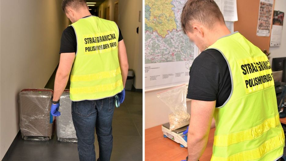 Funkcjonariusze Służby Celno-Skarbowej podczas prześwietlania bagaży rejsowych na urządzeniu RTG Heimann, oznaczyli walizkę, która na monitorze urządzenia wskazywała dużą ilość jednolitego towaru. W wyniku rewizji celnej ujawniono 8 paczek pakowanych próżniowo z zawartością substancji narkotycznej, ukrytych w ścianach walizek.