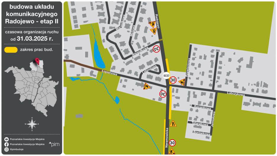 31 marca kierowcy poruszający się w rejonie skrzyżowania ulic Lubczykowej, Naramowickiej, Radojewo i Łopianowej muszą przygotować się na zmiany w organizacji ruchu. Powodem jest rozpoczynająca się przebudowa, która ma poprawić bezpieczeństwo oraz usprawnić komunikację w tej części miasta.