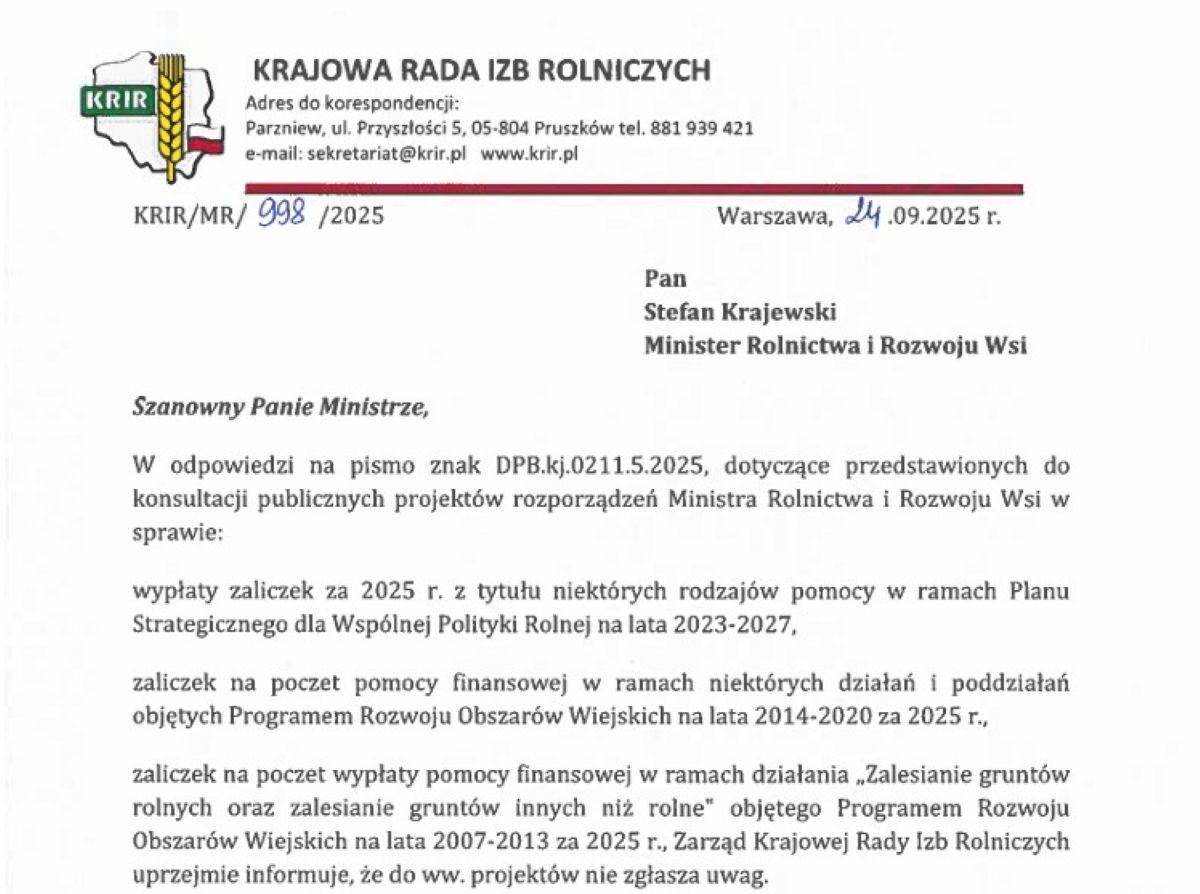 Uściślając, Krajowa Rada Izb Rolniczych w oficjalnym piśmie skierowanym do ministra rolnictwa, Stefana Krajewskiego poparła projekty rozporządzeń Ministerstwa Rolnictwa i Rozwoju Wsi dotyczące wypłaty zaliczek na poczet płatności obszarowych za 2025 rok. Przy czym podkreśliła, że wypłaty powinny być szybsze i wyższe, bowiem to kluczowa pomoc dla wielu poszkodowanych gospodarstw. Według KRIR, takie rozwiązanie złagodzi problemy rolników poszkodowanych przez skandal z pietruszką z zadłużaniem się w bankach i innych instytucjach finansowych.