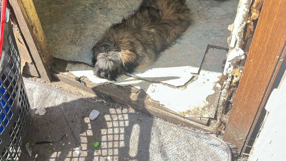 Skrajnie zaniedbany pies na posesji w Gdańsku. Interweniowała straż miejska