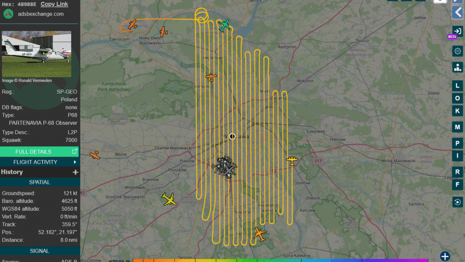 Od rana podesłaliście nam informacje o samolocie który krąży nad Warszawą. Jest to maszyna, którą do różnych zadań używa firma Opegieka z Elbląga. Najczęściej są to przeloty fotogrametryczne, mające za zadanie tworzenie fotografii lotniczej. Ze względu na dzisiejszą pogodę i brak zachmurzenia tak pewnie jest i teraz. Samolot wyruszył z Modlina, około godziny 9:00 rano i odbywał się na wysokości około 1500 metrów. Misja zakończyła w Modlinie około godziny 13:30.