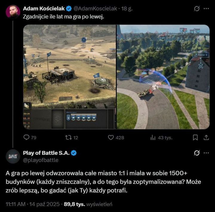 Mniej merytorycznie wyglądają za to dyskusje w serwisie X, w których udział postanowiło wziąć oficjalne konto studia Play of Battle. Osoba zarządzająca profilem kiepsko zniosła porównanie grafiki Systemic War z 19-letnią strategią Company of Heroes i w odpowiedzi zamieściła zdanie „Może zrób lepszą [grę – dop. red], bo gadać (jak Ty) każdy potrafi”. Rozumiem oczywiście, że krytyka może wywoływać frustrację, ale takie słowa nigdy nie prowadzą do niczego dobrego. Jak można się było spodziewać, negatywny odzew tylko się zwiększył, oberwało się jednak nie tylko samej produkcji, ale też jej twórcom.
