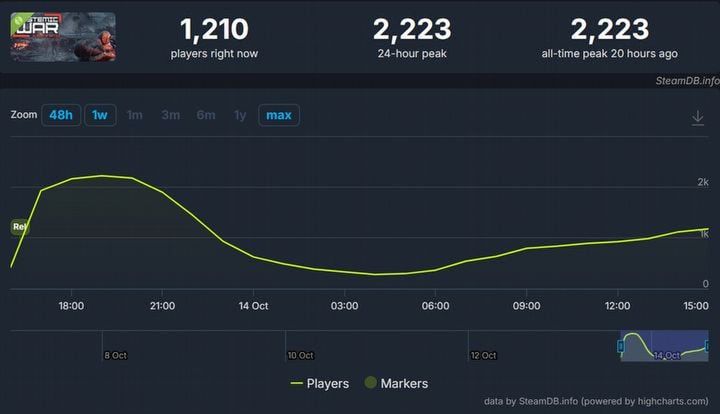 Systemic War – dane pokazujące liczby graczy w tym samym momencie od debiutu dema.SteamDB