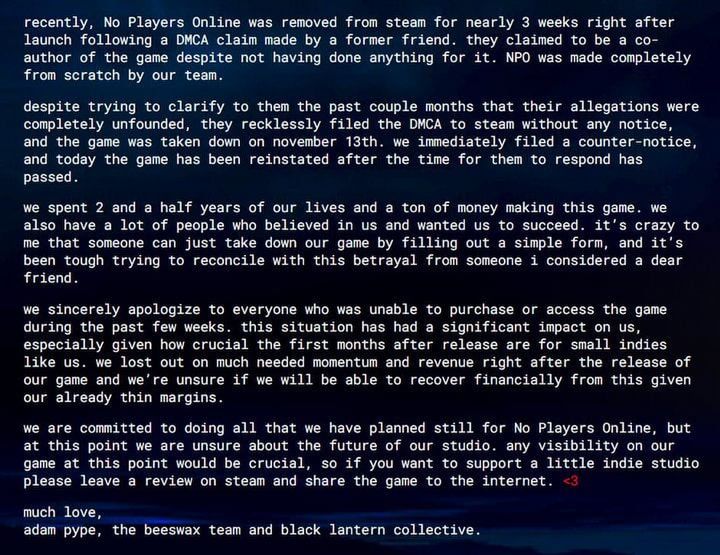 Niewielka produkcja mogła liczyć na zaangażowanych graczy, ale bez pomocy ze strony Steama jej premiera „została kompletnie zabita”. Mowa o nietypowym dziele No Players Online, którego tytuł okazał się proroczy – krótko po premierze nagle zniknęło ono ze sklepu Gabe’a Newella. Zaskoczeni użytkownicy długo musieli czekać na wyjaśnienia, tymczasem problem sprokurował jeden ze znajomych deweloperów, roszcząc sobie prawo do miana współtwórcy. Steam nie zareagował na argumenty studia Beeswax Games i na 3 tygodnie zablokował sprzedaż No Players Online.