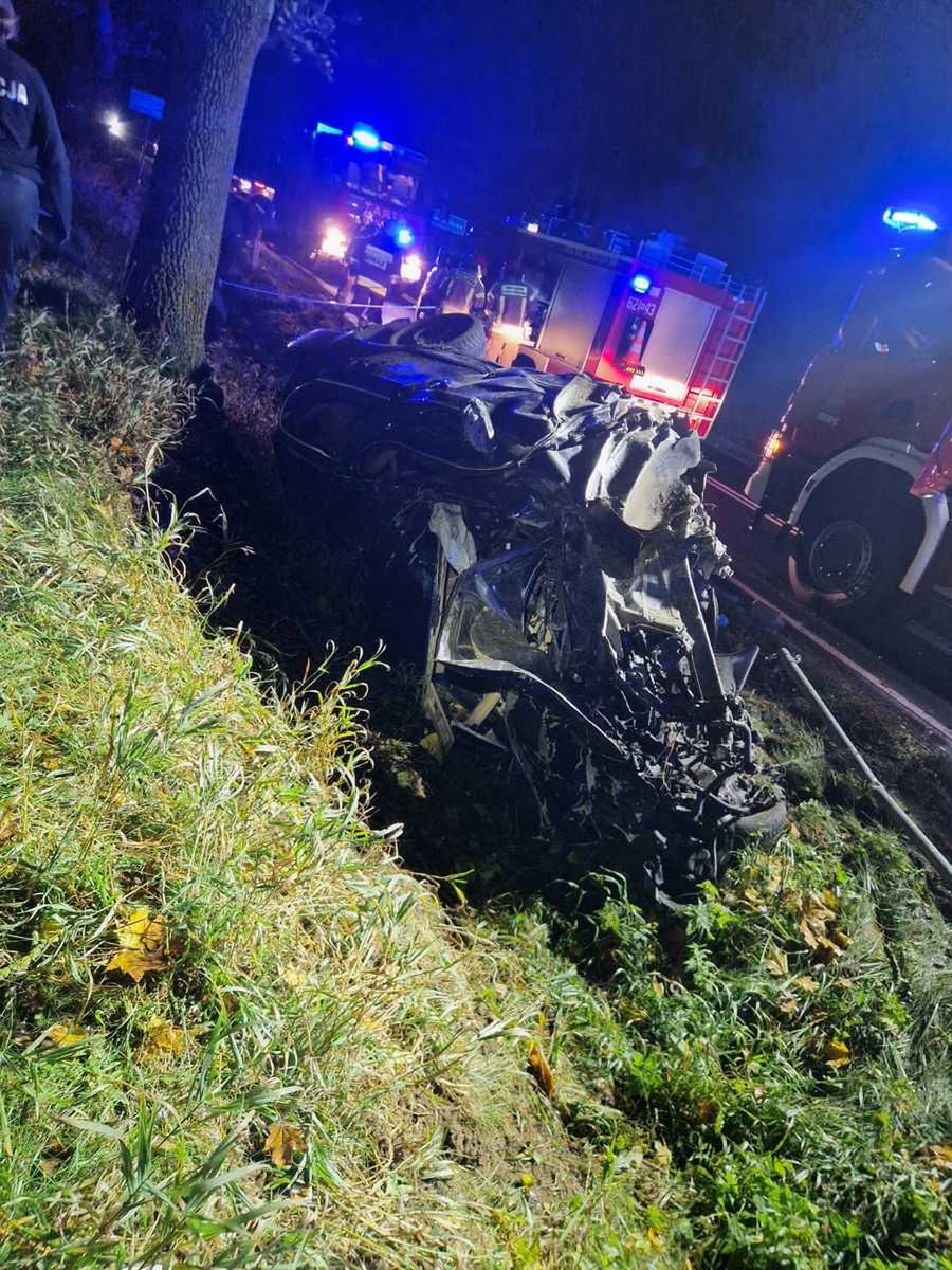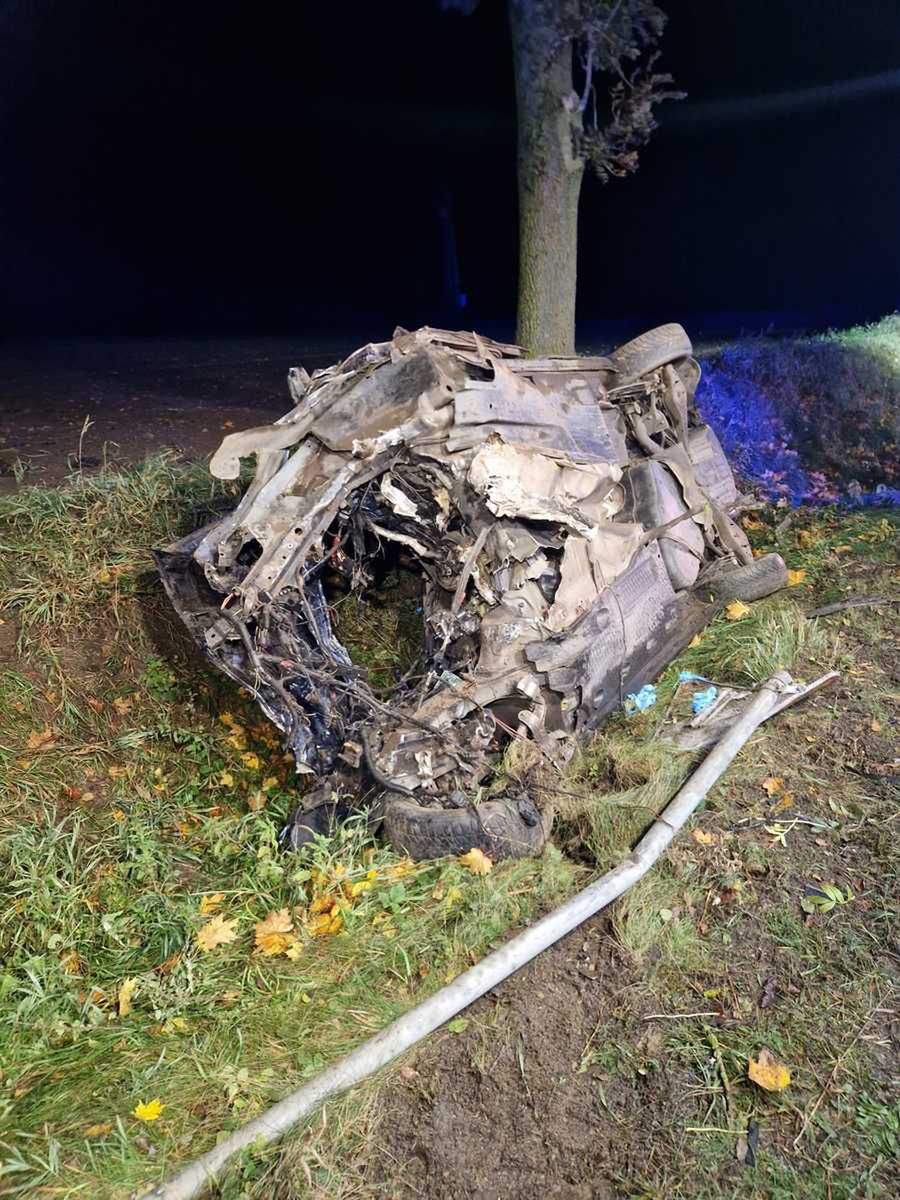 Babiec Piaseczny: Volkswagen uderzył w nasyp i drzewo. Młody kierowca nie miał szans na przeżycie