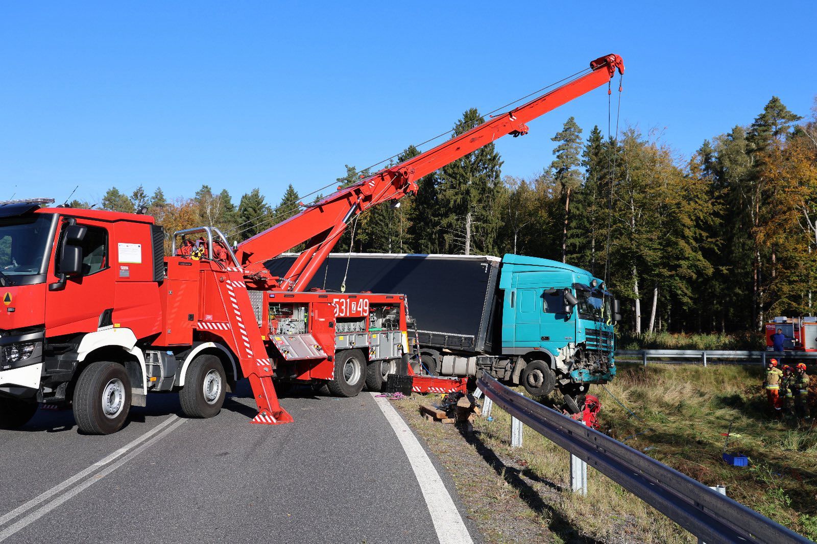 Na miejscu pracowało sześć zastępów straży pożarnej, policja oraz ratownicy medyczni. Wezwano także specjalistyczną grupę ratownictwa technicznego, która podniosła ciężarówkę i umożliwiła dokładne sprawdzenie zniszczonego samochodu.