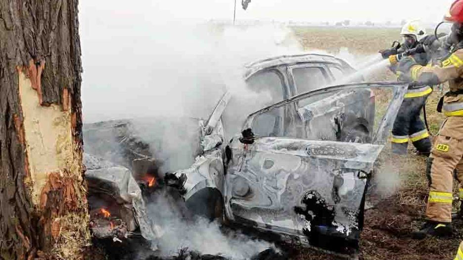 Do makabrycznego wypadku doszło w miejscowości Bielawy. Kierujący elektrycznym autem uderzył w drzewo. Samochód spłonął z kierowcą.