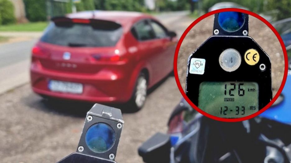 Na zdjęciu z policyjnego pomiaru widnieje wynik: 126 km/h. Obok policyjny motocykl i zatrzymany seat. To efekt jednej decyzji, która może kosztować znacznie więcej niż utratę prawa jazdy.