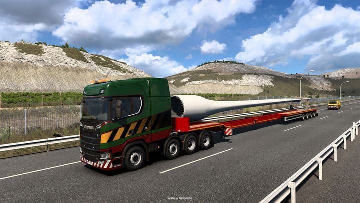 Pierwszy z nich to łopata turbiny wiatrowej o długości 30 metrów, transportowana na specjalnej czteroosiowej naczepie z pełnym układem skrętnym. Sam zestaw waży ponad 26 ton, a przez wzgląd na jego długość za kierownicą potrzebna będzie ogromna precyzja, zwłaszcza na wąskich drogach i ciasnych zakrętach. Misje z tym ładunkiem rozegramy na trasach Rostock–Berlin w Niemczech oraz w nadchodzącym dodatku Nordic Horizons (na odcinku Jyväskylä–Vaasa).