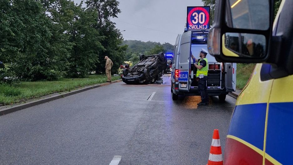Według informacji ze zgłoszenia wynika, że kierowca pojazdu miał stracić panowanie na łuku, a w konsekwencji dachować.