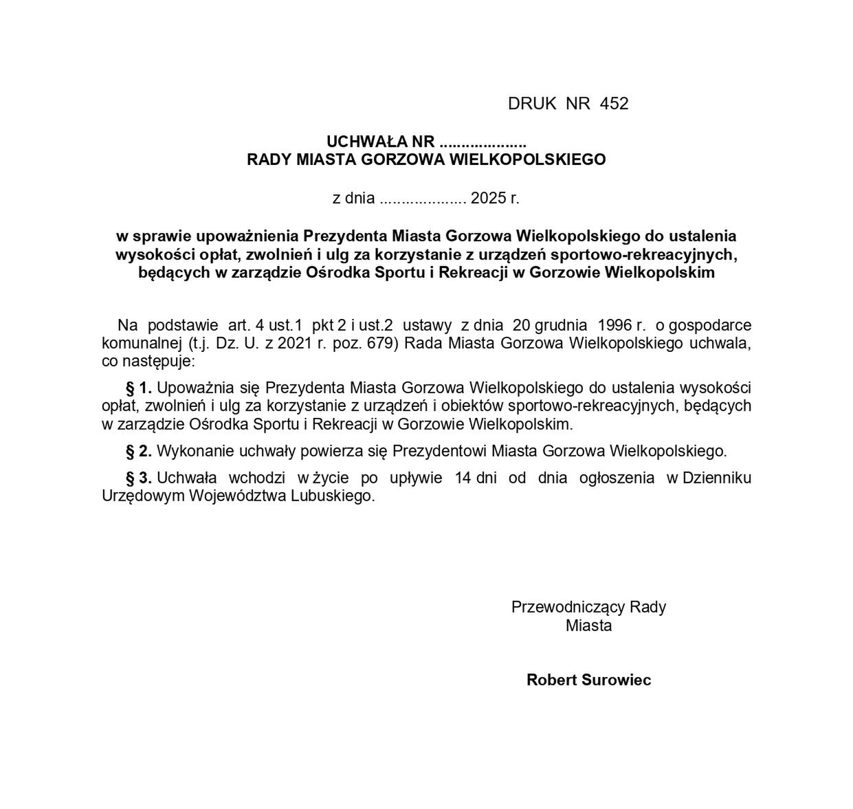 Podczas sesji Rady Miasta Gorzowa, która odbędzie się we wtorek 28 października, radni mają zagłosować nad uchwałą w "w sprawie upoważnienia Prezydenta Miasta Gorzowa Wielkopolskiego do ustalenia wysokości opłat, zwolnień i ulg za korzystanie z urządzeń sportowo-rekreacyjnych, będących w zarządzie Ośrodka Sportu i Rekreacji w Gorzowie Wielkopolskim".