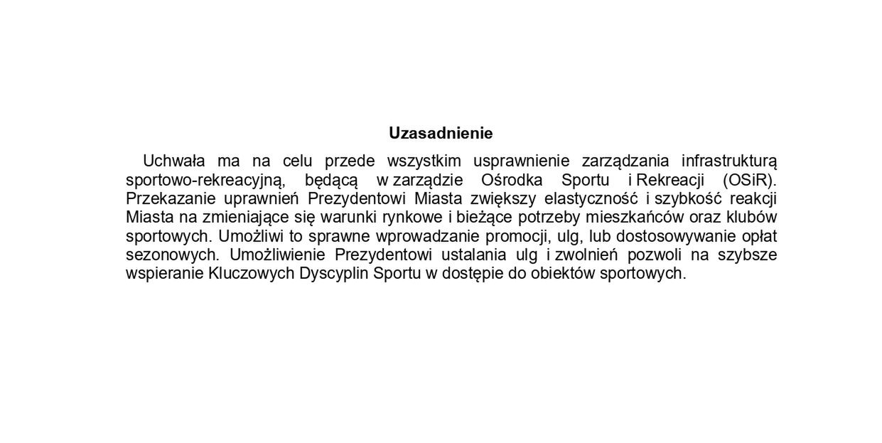 W uzasadnieniu uchwały czytamy, że "nowe przepisy mają usprawnić zarządzanie miejską infrastrukturą sportową". Chodzi m.in. o możliwość wprowadzania promocji, dostosowywania opłat do sezonu czy szybkiego reagowania na potrzeby mieszkańców.