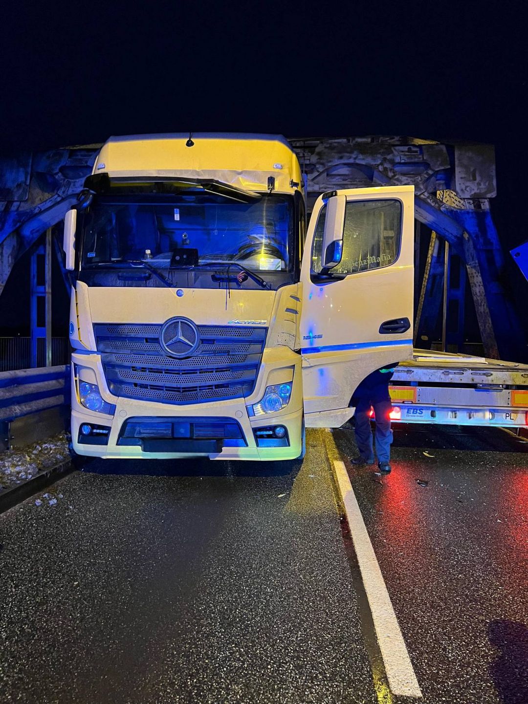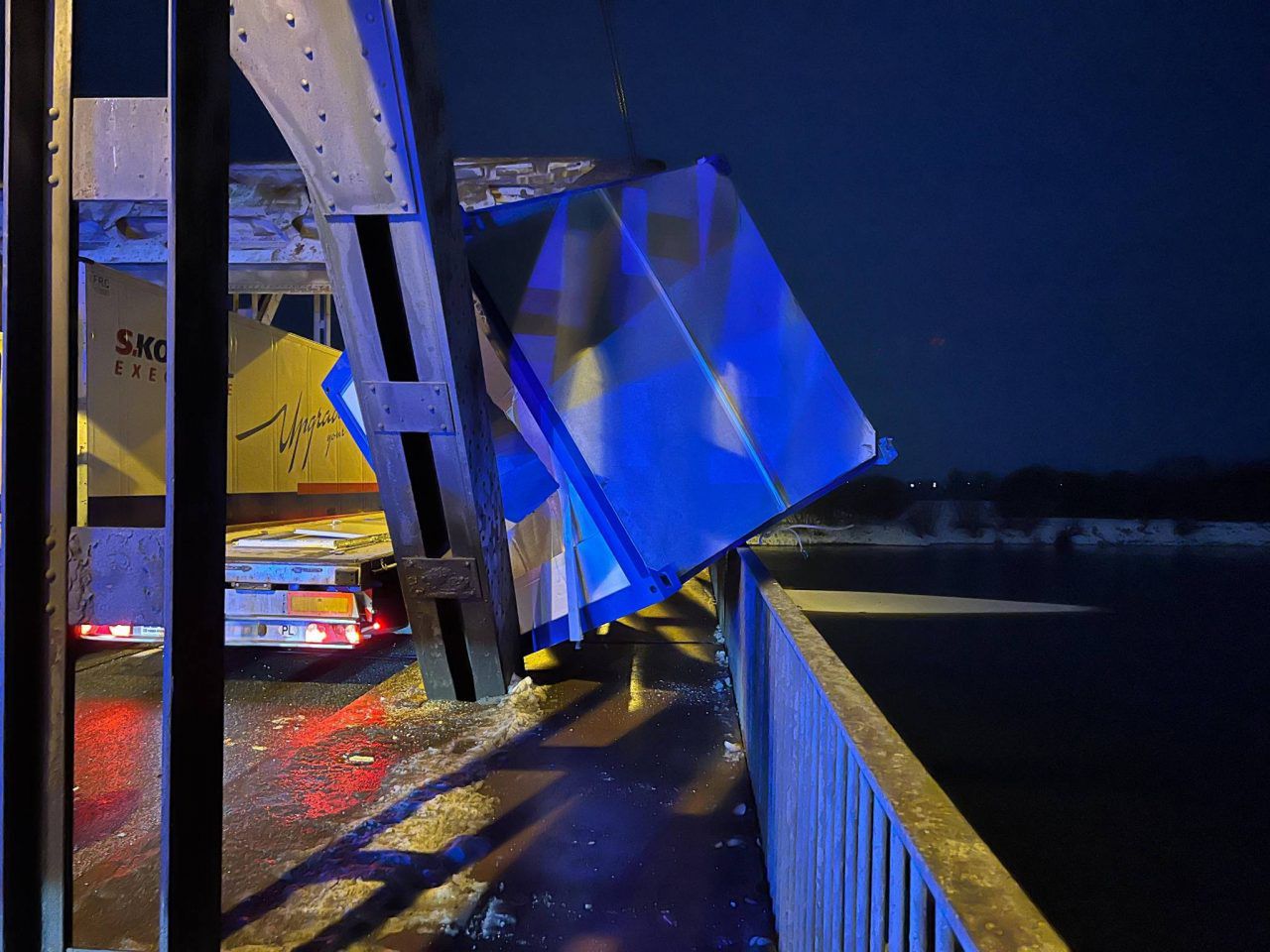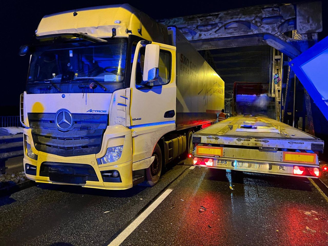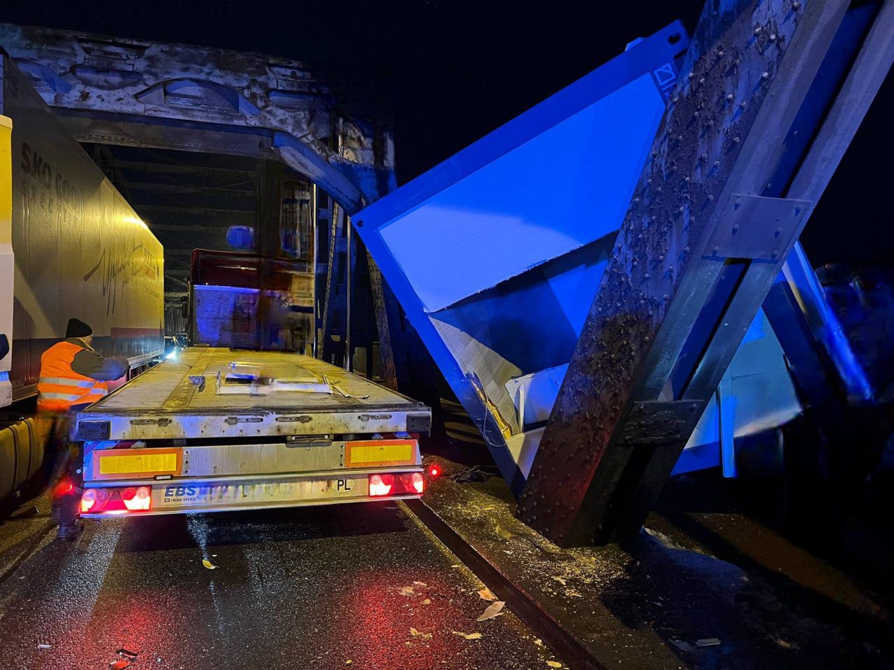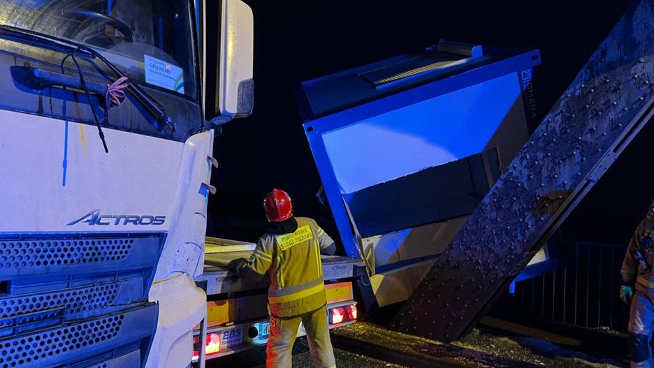 Na moście przy ul. Gdyńskiej w Grudziądzu, na odcinku drogi krajowej nr 16, służby ratunkowe od wczesnych godzin porannych prowadziły działania po groźnym zdarzeniu z udziałem dwóch pojazdów ciężarowych. Do zderzenia doszło o godz. 6:17. Oba zestawy transportowe przewoziły kontenery, a siła uderzenia spowodowała ich przemieszczenie. Jeden z nich wysunął się z mocowań i uderzył w barierę ochronną, doprowadzając do jej poważnego naruszenia.