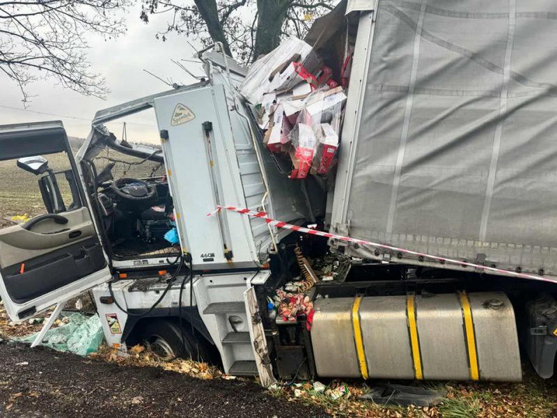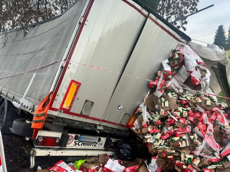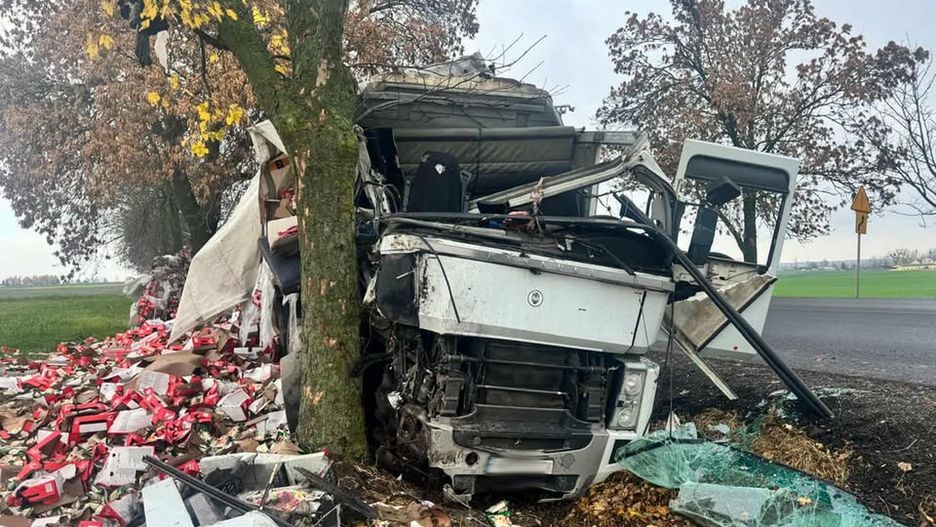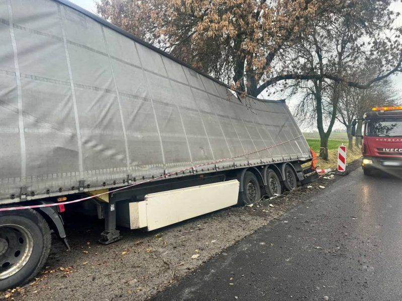 Ciągnik siodłowy z naczepą wypełnioną towarem wjechał do rowu, a następnie uderzył w drzewo. Przewożony na naczepie ładunek częściowo wysypał się na przydrożne pole. Na szczęście nikt nie został poszkodowany. Na miejscu interweniowali funkcjonariusze policji oraz strażacy, którzy zabezpieczyli teren zdarzenia i wprowadzili ruch wahadłowy. Jeden pas ruchu był zablokowany. Obecnie nadal mogą występować utrudnienia z przejazdem.