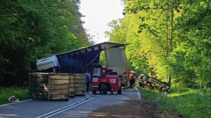 Lidzbark: Ciężarówka z drobiem rozbiła się i zablokowała drogę na 5 godzin!