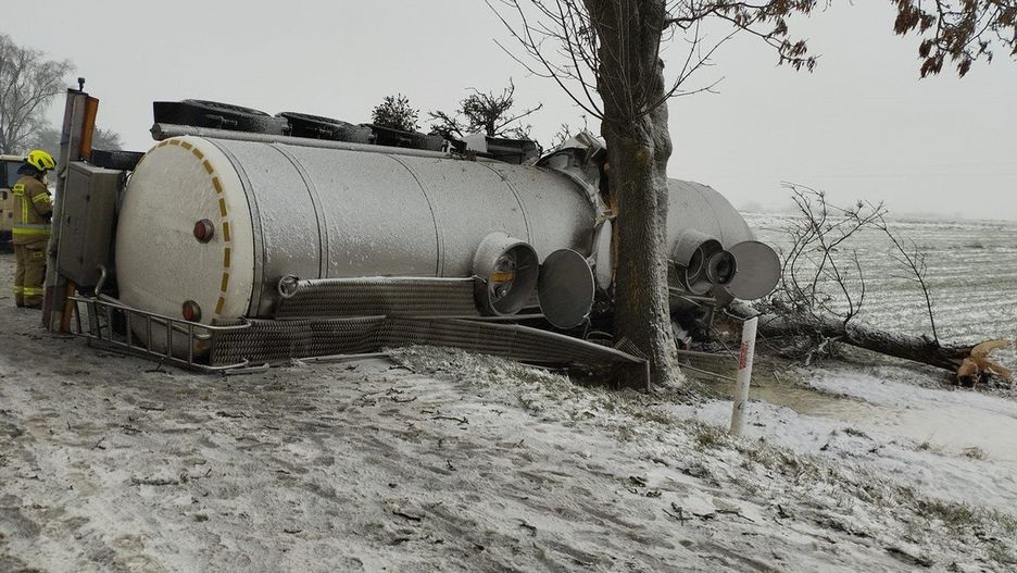Zdarzenie na drodze wojewódzkiej nr 850 w Wieprzowie w powiecie tomaszowskim pokazuje, jak groźna może być śliska nawierzchnia. 61-letni kierowca cysterny nie dostosował prędkości do warunków panujących na drodze, zjechał na pobocze, a pojazd wywrócił się do przydrożnego rowu. W tym samym miejscu doszło do kolejnej kolizji: kierujący busem zatrzymał się przed leżącą cysterną, a w tył jego pojazdu wjechał 18-latek kierujący oplem. Na miejscu pracują służby ratunkowe.