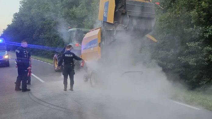 Z maszyny rolniczej, podczepionej do ciągnika John Deere, zaczęły wydobywać się płomienie. Paliły się gumowe elementy prasy oraz znajdująca się w niej słoma. Policjanci natychmiast zatrzymali się i rozpoczęli akcję gaśniczą, używając gaśnic z radiowozów.