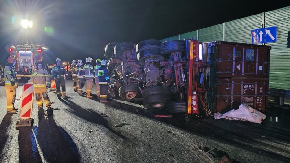 Mazowieckie: Nocna kolizja na DK7. Ciężarówka z kontenerami przewróciła się na remontowanym odcinku