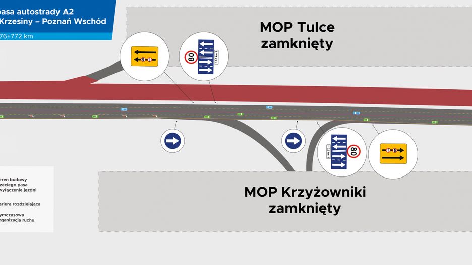 Na odcinku od 171 do 176 kilometra A2 ruch został przeniesiony na jezdnię południową, gdzie wyznaczono cztery pasy – po dwa w każdym kierunku. Taki sam układ obowiązuje od dziś również na kolejnym fragmencie – między 176 a 177 km. Na lewych pasach w obu kierunkach obowiązuje zakaz poruszania się pojazdów ciężarowych. W całym rejonie prac obowiązuje ograniczenie prędkości do 80 km/h, a w miejscach zmiany pasa – do 60 km/h. Pas awaryjny jest niedostępny.