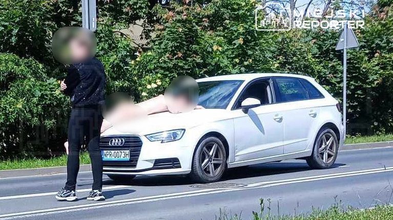 Piaseczno. Nagi obywatel Ukrainy położył się na masce Audi. Wcześniej wyskoczył z trzeciego piętra