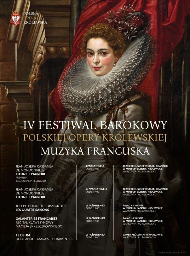 Premiera opery „Titon et l’Aurore” Jeana-Josepha de Mondonville’a zainauguruje 4. Festiwal Barokowy Polskiej Opery Królewskiej, tym razem wypełniony pełną wyrafinowania i elegancji muzyką francuskich kompozytorów. W sobotę 11 października 2025 roku zabrzmią kantaty z cyklu „Les quatre saisons” Josepha Bodina de Boismortiera w interpretacji Olgi Pasiecznik, Adama Dobka i Zespołu Instrumentów Dawnych Polskiej Opery Królewskiej Capella Regia Polona. 12 października 2025 roku w Pałacu na Wyspie koncert „Galanteries Françaises” będzie recitalem jednego z najbardziej utalentowanych klawesynistów młodego pokolenia – Macieja Skrzeczkowskiego. W finałowym koncercie 18 października 2025 roku zabrzmią dzieła najsłynniejszych mistrzów czasów panowania Króla Słońce – jeden z wielkich motetów Richarda Delalande’a „Super flumina Babylonis”, „Suite en trio e minore” Marina Marais oraz pełne światła i triumfu „Te Deum” Marca Antoine’a Charpentiera.