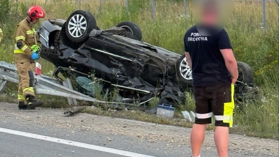 Według wstępnych ustaleń, bus zderzył się z osobówką, która następnie uderzyła w barierki energochłonne i dachowała. Dwie osoby podróżujące autem są obecnie pod opieką ratowników medycznych.