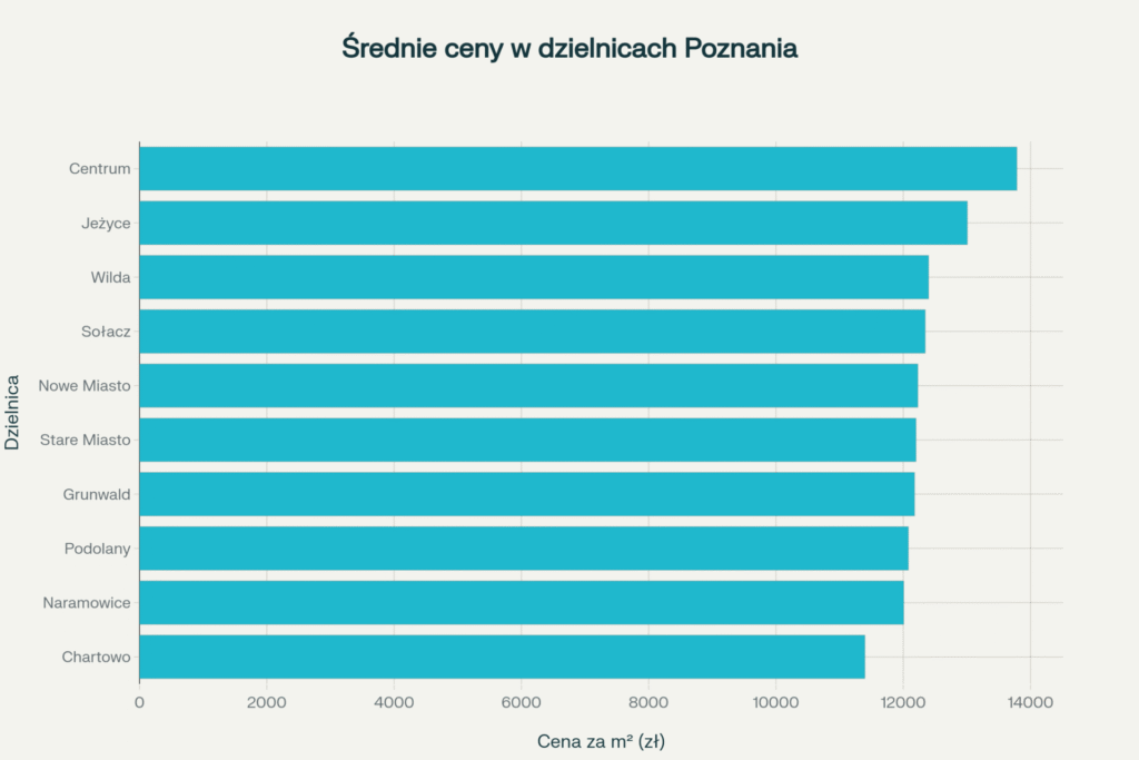 Centrum pozostaje najbardziej prestiżową lokalizacją ze średnią ceną 13 785 zł/m², oferując bliskość najważniejszych instytucji miejskich i doskonałą komunikację. Jeżyce utrzymują swoją pozycję jako jedna z najpopularniejszych dzielnic ze średnią ceną 13 007 zł/m². Dzielnica została uznana przez National Geographic Traveler za jedną z najbardziej klimatycznych dzielnic w Polsce, przyciągając młodych profesjonalistów bogatą ofertą gastronomiczną i kulturalną.