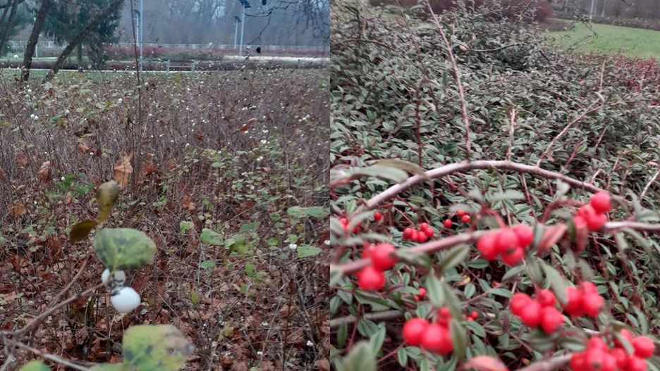 Najbardziej uwagę przyciągają jabłonie i berberysy, dosłownie uginające się pod ciężarem czerwonych owoców. To naturalna stołówka dla ptaków, które licznie zaglądają tu w poszukiwaniu zimowego zapasu energii. Jednocześnie rośliny te tworzą wyjątkową, niemal świąteczną scenerię – prostą, ale niezwykle urokliwą.