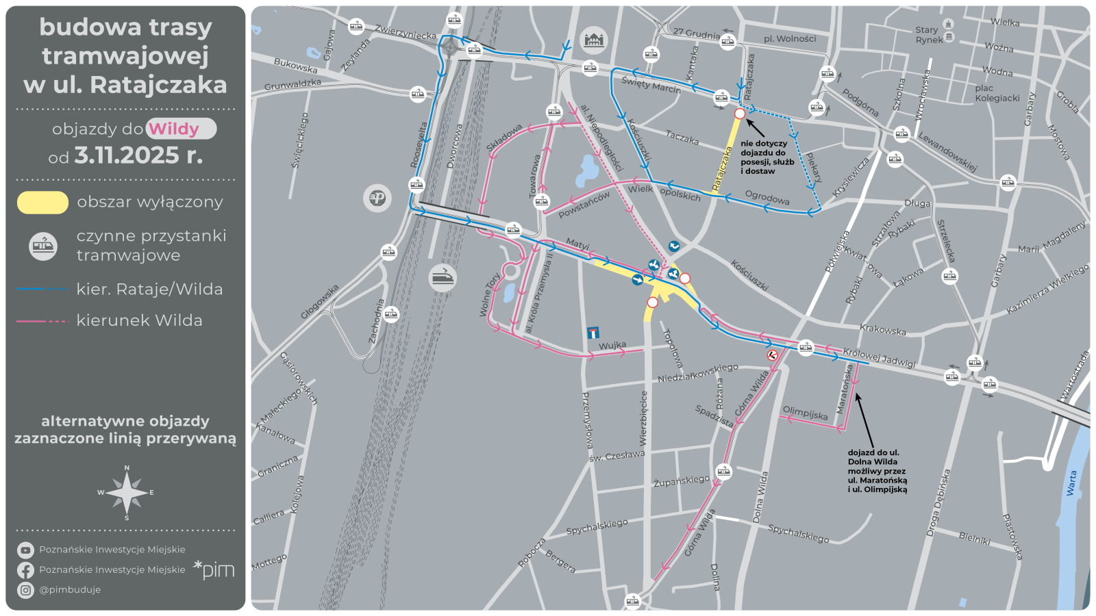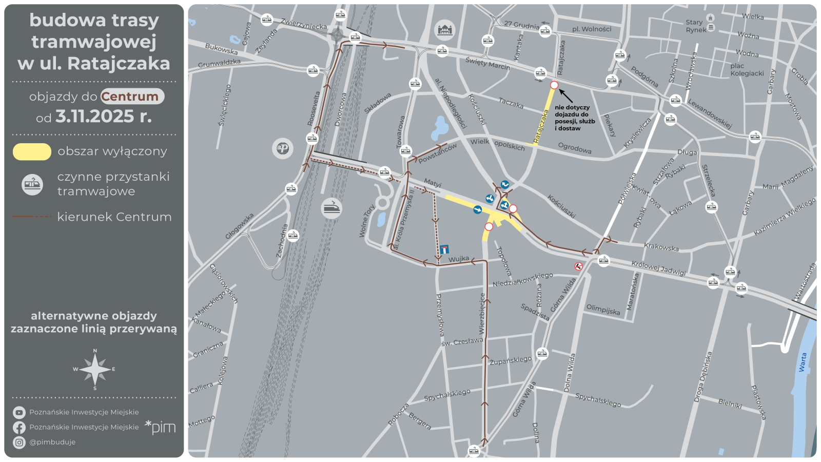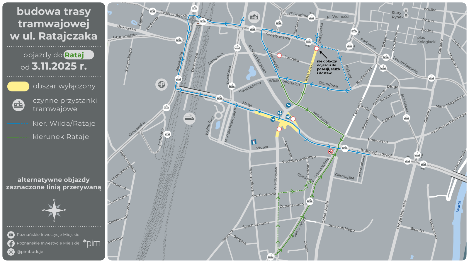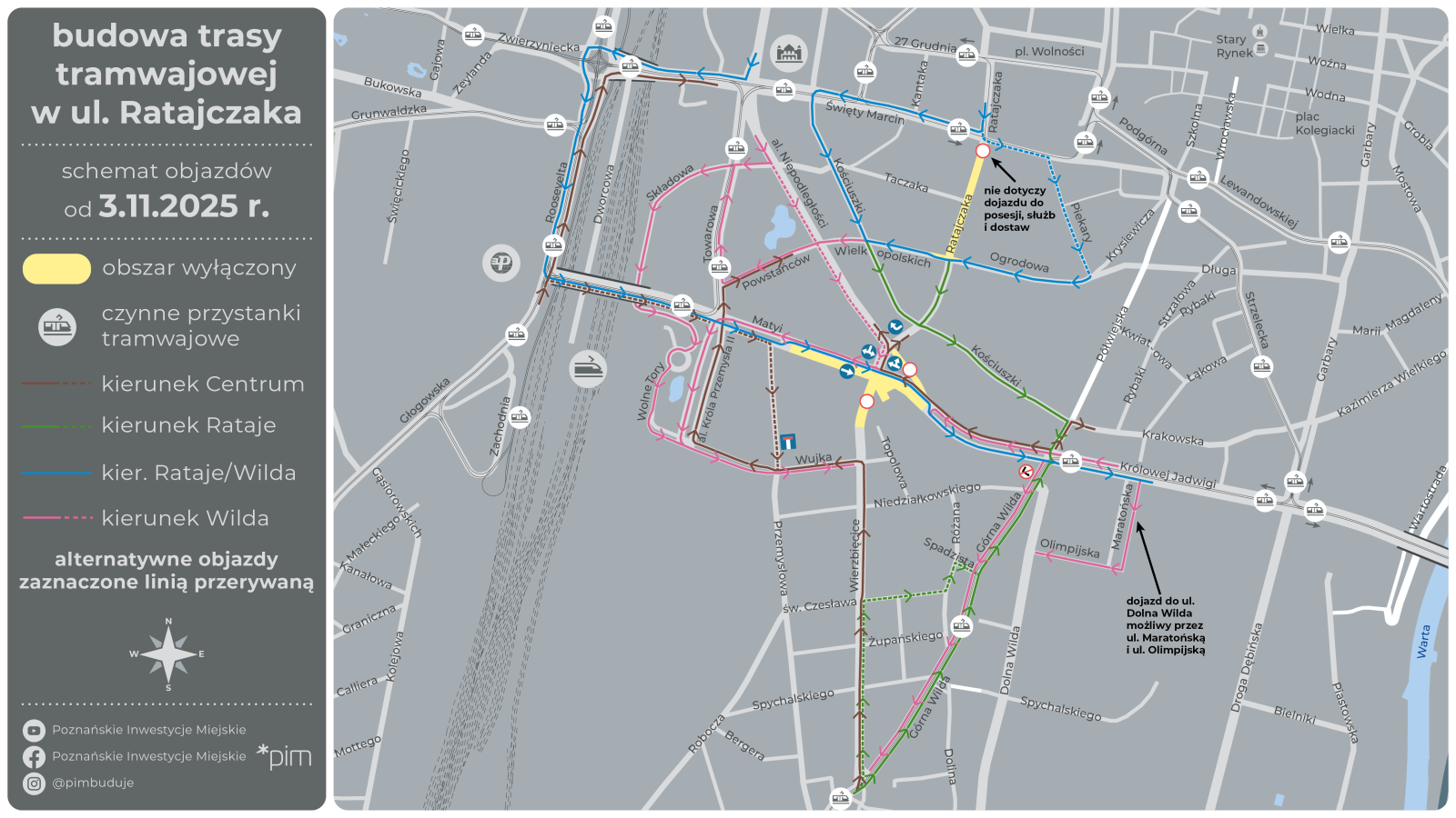 Dzięki wcześniejszej przebudowie skrzyżowania Św. Marcin–Ratajczaka tramwaje będą nadal kursować ulicą Św. Marcin, jednak pozostała część sieci zostanie czasowo zmieniona. ZTM zapowiada, że pełny ruch tramwajowy przez ul. Matyi i Wierzbięcice ma zostać przywrócony dopiero w trzecim kwartale 2026 roku.