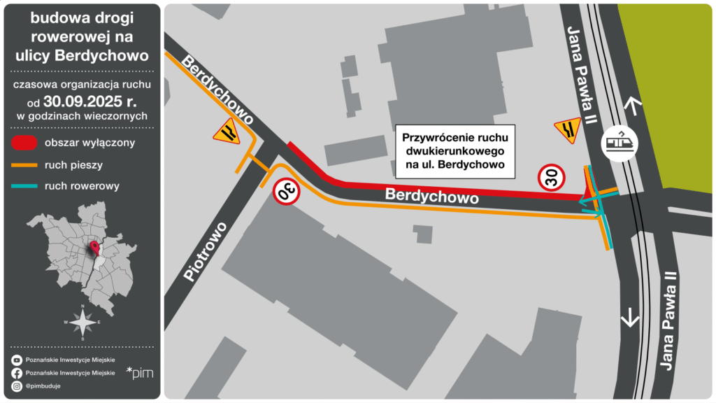 W kolejnych tygodniach prowadzone będą prace związane z sygnalizacją świetlną oraz infrastrukturą pieszo-rowerową przy ul. Jana Pawła II – na wysokości ul. Berdychowo, po stronie zachodniej. Lokalizacja ciągów pieszych i rowerowych w tym miejscu może być zmieniana w zależności od postępu prac, dlatego piesi i rowerzyści proszeni są o zachowanie szczególnej ostrożności.