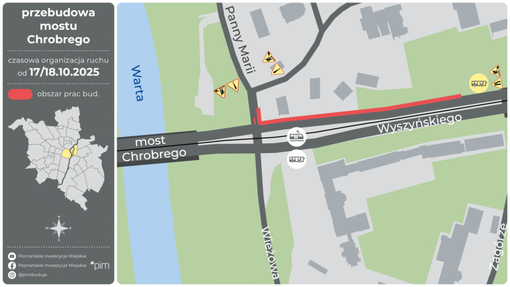 Przebudowa mostu Bolesława Chrobrego wchodzi w nowy etap. Od dzisiejszej nocy wykonawca rozpocznie roboty przy sieci gazowej i elektroenergetycznej, co spowoduje pierwsze poważniejsze zmiany w organizacji ruchu. Dodatkowo, w weekend 18–19 października zaplanowano prace torowe na ul. 23 Lutego, które wymuszą czasowe zmiany w kursowaniu tramwajów.