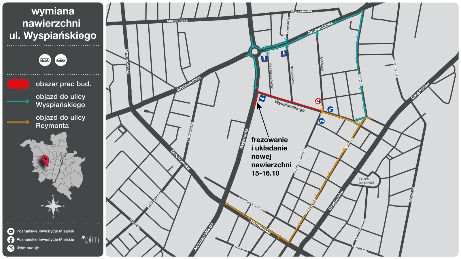 Najbardziej odczuwalne zmiany pojawią się podczas układania nowej nawierzchni bitumicznej. 16 października północna część ul. Wyspiańskiego zostanie zamknięta, a przejazd będzie możliwy wyłącznie w jednym kierunku, od ul. Reymonta do ul. Jarochowskiego. Dzień później podobne rozwiązanie wprowadzono na drugiej połowie jezdni, gdzie ruch nadal pozostanie jednokierunkowy w stronę Jarochowskiego. Kierowcy jadący w stronę ul. Reymonta będą mogli skorzystać z objazdu ulicami Matejki, Kasprzaka i Hetmańską.