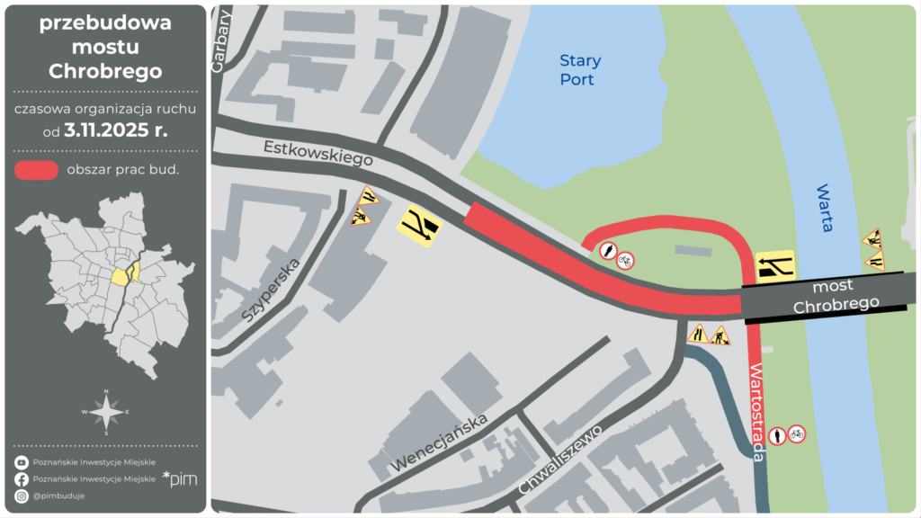 Od poniedziałku, 3 listopada, kierowców i pasażerów komunikacji miejskiej w Poznaniu czekają kolejne zmiany związane z przebudową mostu Bolesława Chrobrego. Spółka Poznańskie Inwestycje Miejskie zapowiada wprowadzenie nowej organizacji ruchu po zachodniej stronie przeprawy, na ul. Estkowskiego, gdzie rozpoczną się prace nad budową tzw. przewiązek.