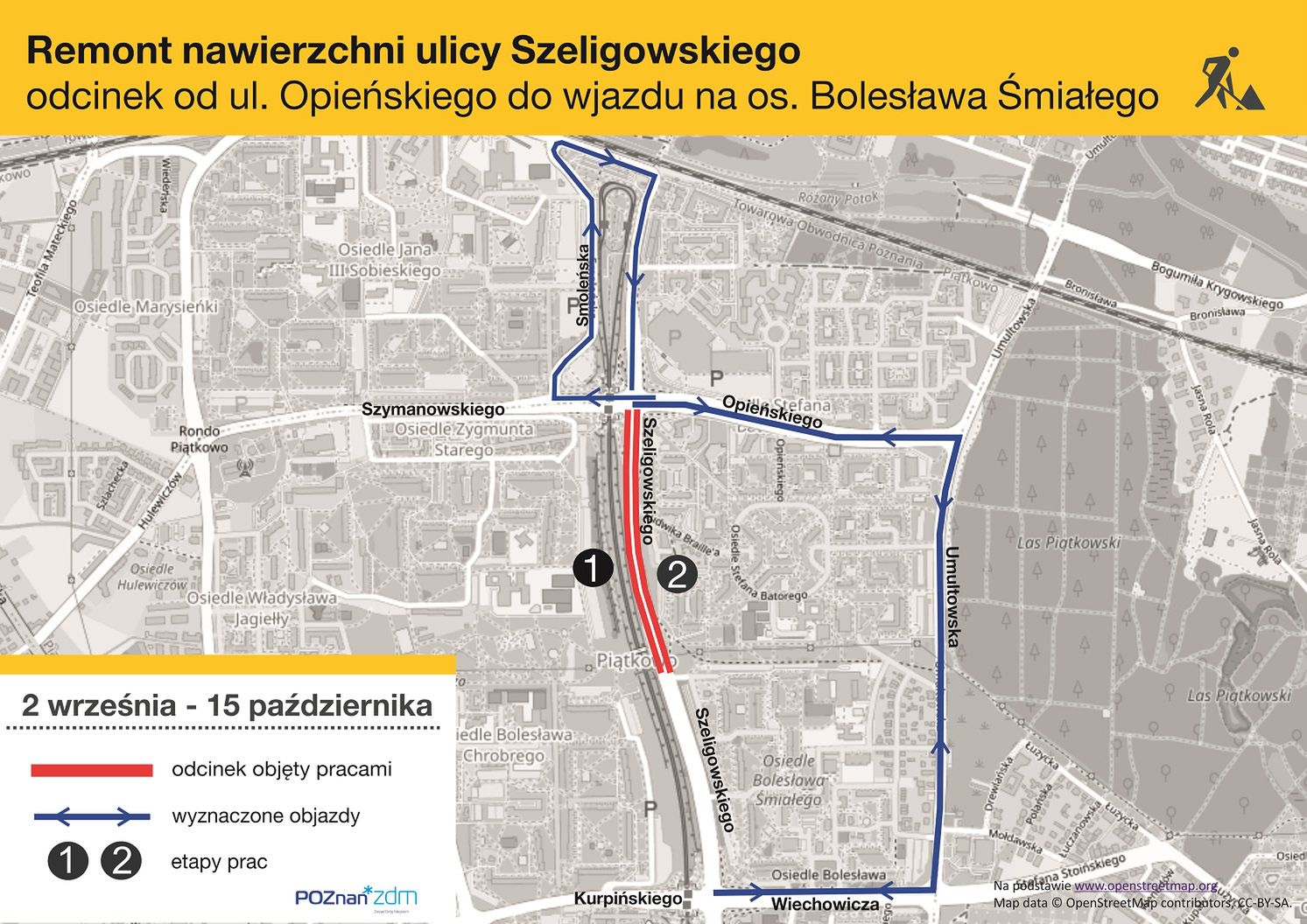 W pierwszym etapie frezowana jest jezdnia w kierunku centrum. Ruch w stronę śródmieścia został przekierowany: kierowcy jadący z północy pojadą objazdem ulicami Opieńskiego, Umultowską i Wiechowicza. Osoby wyjeżdżające z ul. Opieńskiego w kierunku centrum powinny kierować się przez Szymanowskiego, Smoleńską, Stróżyńskiego i ponownie Szeligowskiego. Po zakończeniu tego zakresu brygady przeniosą się na jezdnię wschodnią. Wówczas zmiany obejmą relację z centrum na północ, a objazd poprowadzi ulicami Wiechowicza, Umultowską i Opieńskiego.