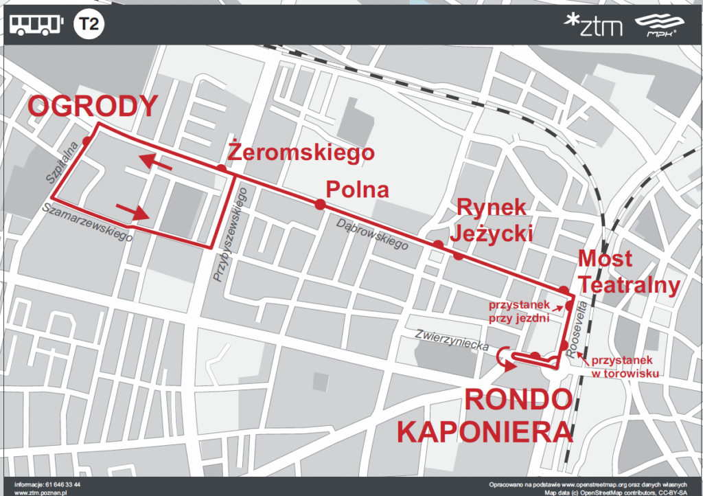 Linia T2 będzie kursować co 10 minut na trasie okólnej: Rondo Kaponiera – Ogrody – Szpitalna – Szamarzewskiego – Przybyszewskiego – Dąbrowskiego – Rondo Kaponiera. Rozwiązanie to umożliwi pasażerom podróżowanie w obu kierunkach bez konieczności dodatkowych przesiadek, np. wsiadając przy przystanku Żeromskiego w stronę Ogrodów, będzie można dojechać dalej w stronę centrum.