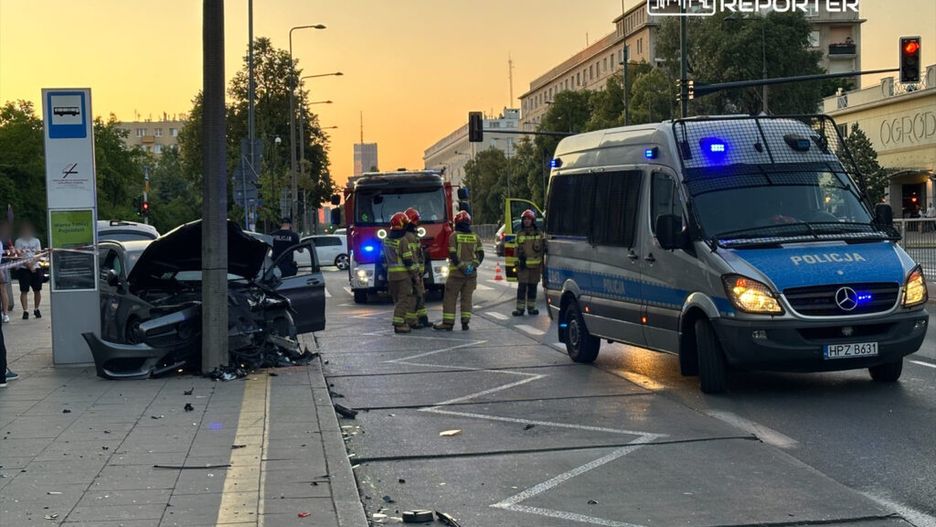Trzy auta zderzyły się w Warszawie. Jedno wjechało w przystanek i uderzyło w latarnię