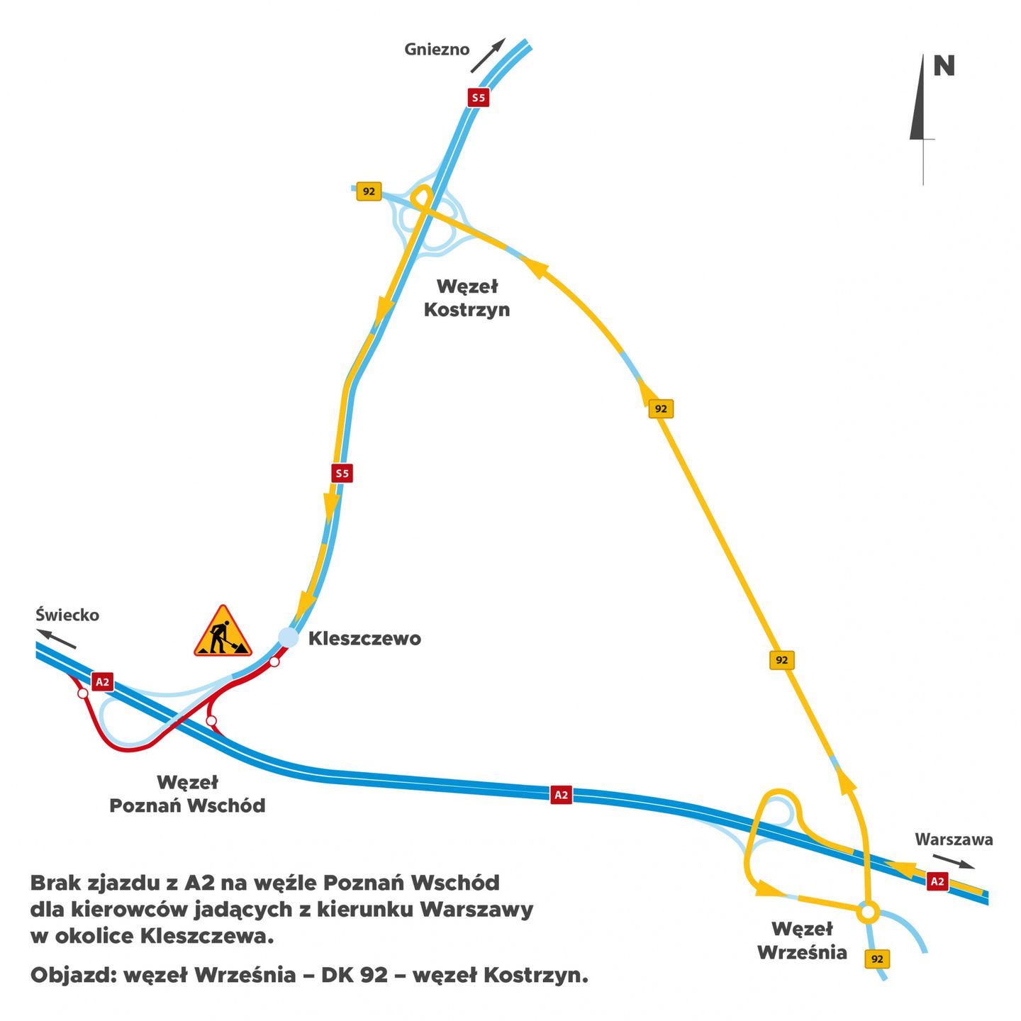 - jadący od strony Warszawy w kierunku Bydgoszczy/Gniezna lub Kleszczewa będą musieli skorzystać z węzła Września i drogą krajową nr 92 dojechać do węzła Kostrzyn,